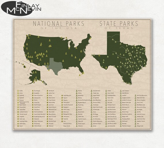 National And State Park Map Of Texas And The United States Etsy